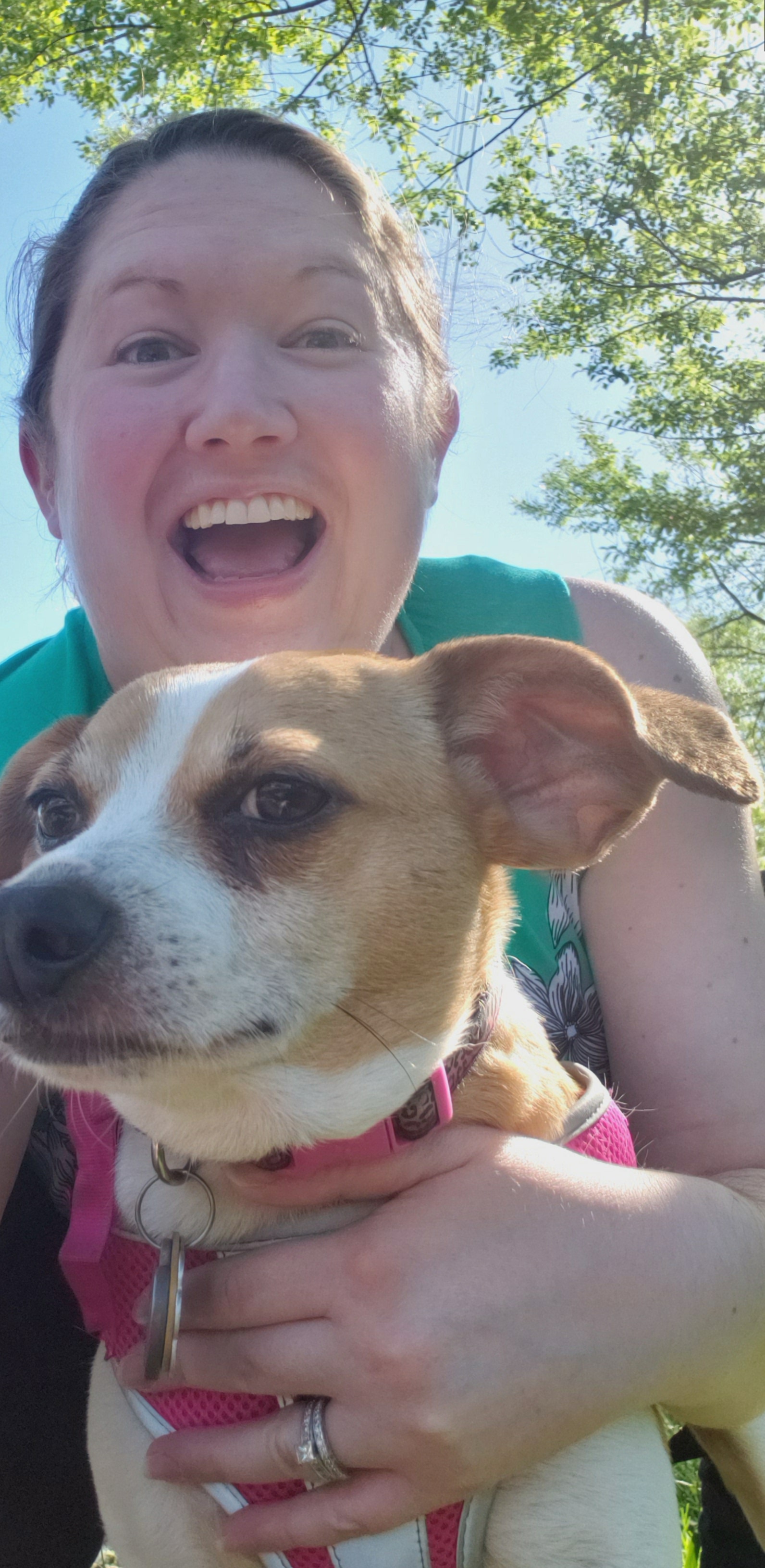 I love taking Daisy for walks when the weather is nice. Not only does it get me outside in the sun and get me exercising a bit, but it provides opportunities for me to take photos of nature and of me and my pup. And Daisy doesn’t mind getting out and about as well as keeping on top of the scents in her neighborhood!